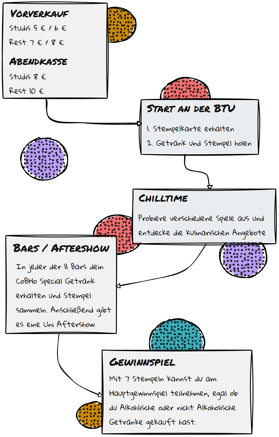 Dein Ort für einen erfolgreichen Start in den Abend des Bar hoppens! Bis 22 Uhr bietet unsere Start – und Chilloutarea. Sie ist der Bereich an dem ihr euch treffen könnt um euch die Stempelkarte, das erste Special und etwas zu essen zu holen.