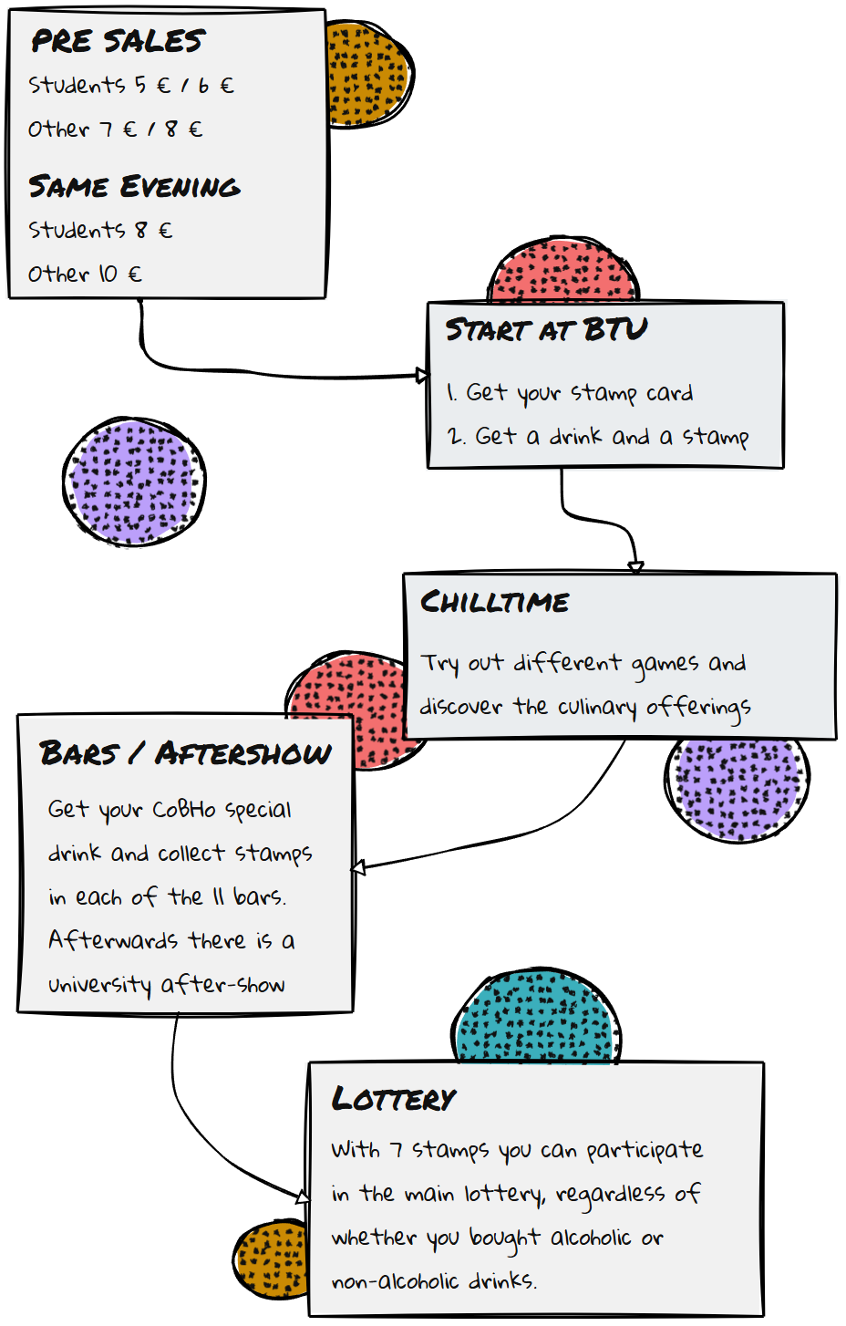 Dein Ort für einen erfolgreichen Start in den Abend des Bar hoppens! Bis 22 Uhr bietet unsere Start – und Chilloutarea. Sie ist der Bereich an dem ihr euch treffen könnt um euch die Stempelkarte, das erste Special und etwas zu essen zu holen.
